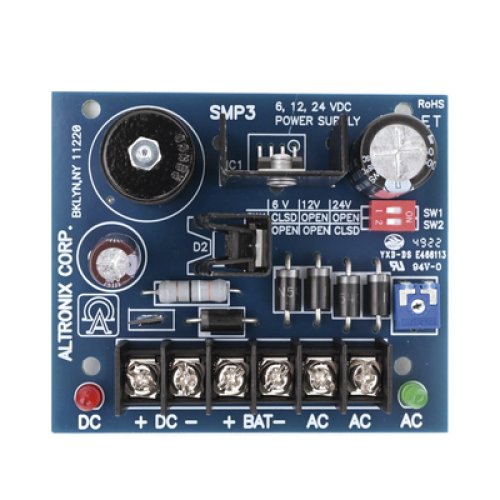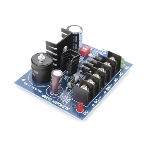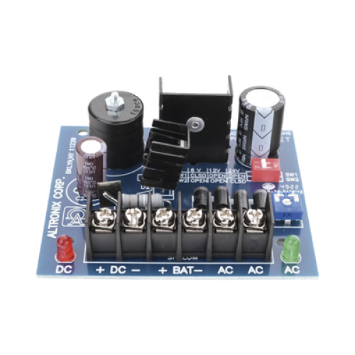 6 o 12 o 24 Vcc @ 2.5 A / fuente tipo tarjeta / 1 salida / requiere transformador de entrada / capacidad de baterías / baterías no incluidas.