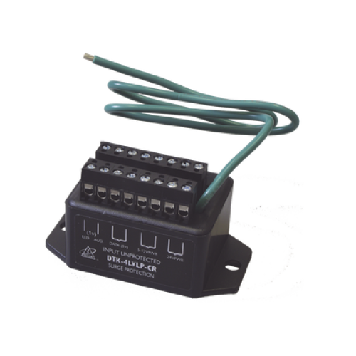 Protector para lazo de 4 pares, para aplicaciones de lectores con formato wiegand : 2 de alimentación de 12 / 24 Vcc, 1 de datos 5 Vcc, 1 señal de 1 Vcc.