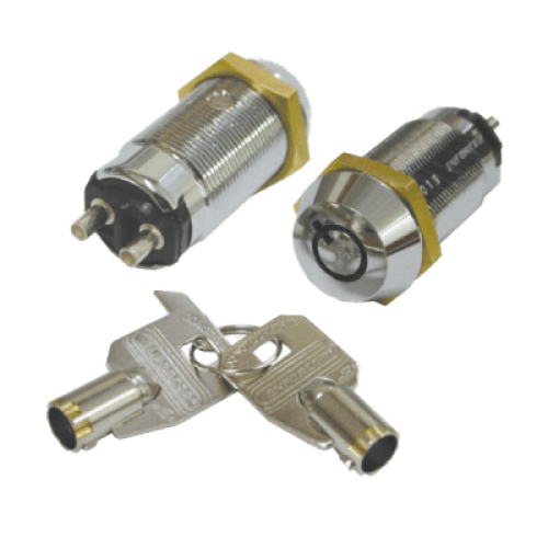 Interruptor de Llave Tubular / Diseño "See-Saw'"Anti retorcimiento / Carcasa de Aleación de Zinc Cromado / Contactos Plateados con Tratamiento Anti-Sulfuración / Base de Bachelita / Terminales Redondos / 2A@12VDC