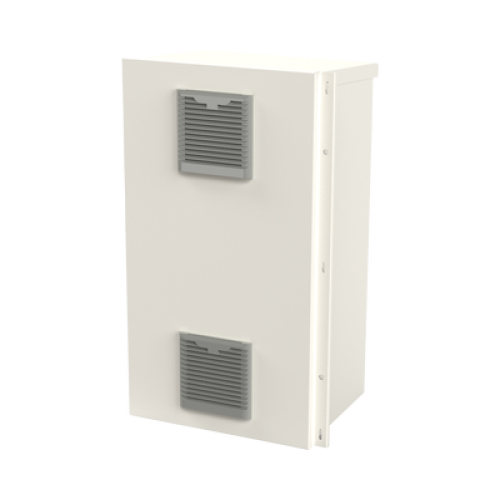 Gabinete Acero Galv. para 2 Baterías PL110D12 (400 x 730 x 300mm). Puerta Ventilada. Acc. para piso o poste No incluidos.