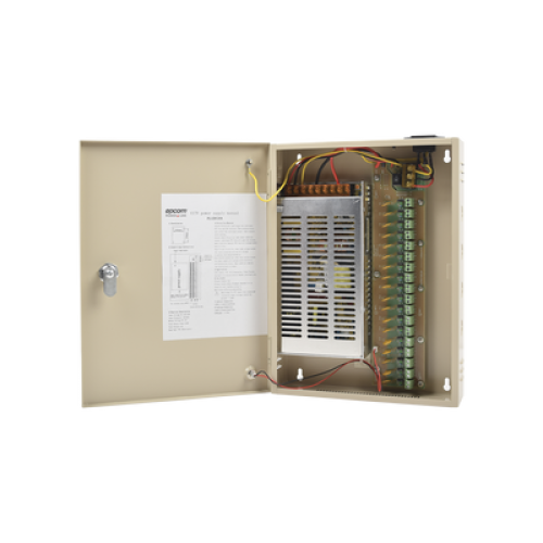 Fuente de alimentación para 12 Vcc, 20 A, 18 salidas; Voltaje de entrada : 100-240 Vca, con capacidad de respaldo, requiere batería
