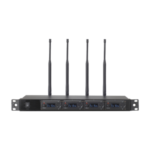 - El sistema de micrófono inalámbrico de 4 canales consta de 4 conjuntos de módulos receptores UHF independientes con 100 frecuencias entre 700-900MHz.