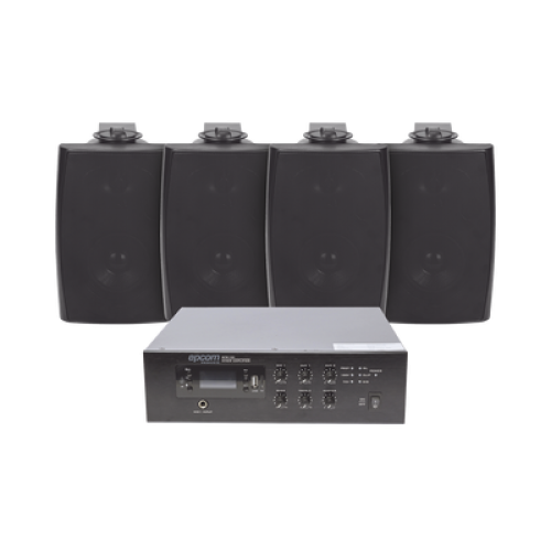 KIT de Amplificador de 120W para Escritorio | 4 Altavoces de Pared color Negro 2.5W - 20W | Sistema 70/100V