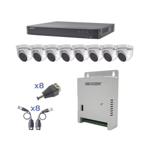 KIT TurboHD 1080p / DVR 8 Canales / 8 Cámaras Eyeball (exterior 2.8 mm) / Transceptores / Conectores / Fuente de Poder Profesional hasta 15 Vcc para Larga Distancia