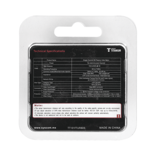 El balún de video TT-101-FTURBOS es un dispositivo pasivo que permite la transmisión de señales de video CCTV HD en tiempo real a través de un cable de par trenzado, cuenta con conectores de Cobre que ofrecen mayor conductividad, mejor desempeño en altas frecuencias(Video HD y largas distancias) y mucho menor atenuación, algunas de las principales ventajas de este equipo es que cuenta con TVS (supresor de voltaje transitorio) de estado sólido incorporado para protección contra sobretensiones, es antiestático, ofrece protección contra rayos Grado 3, Inmunidad al ruido y diafonía de 60 dB. y rechazo excepcional de interferencias. Es compatible con todas las cámaras analógicas HD-TVI/ CVI/ AHD/ CVBS y ampliamente usado en cámaras de CCTV, monitores, DVR, conmutadores, codificadores IP y otros equipos CCTV. Cuenta con terminales tipo tornillo y uno de los tranceptores con coleta (PIG TAIL) para una facil conexion al dvr. Definitívamemte en equipo Premium, la competencia no ofrece tanto en sus productos.