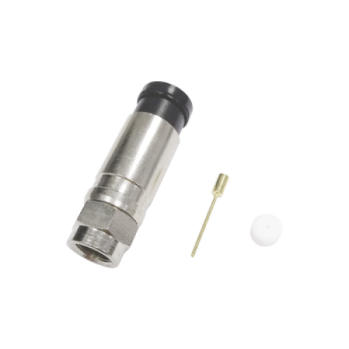 Conector F Macho de Compresión Axial con Borne Negro para instalar en Cable Coaxial RG-11, 75 Ohm, Bronce-Niquelado.