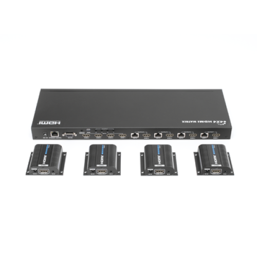 MATRICIAL Y EXTENSOR DE VIDEO HDMI 4 x 4 / 4 Entradas HDMI / 4 Salidas HDMI Loop / 4 Salidas RJ45 para Extender la señal 40 metros por salida / 1080 @ 60Hz / Conmutación por RS232, Control Remoto o Ethernet.