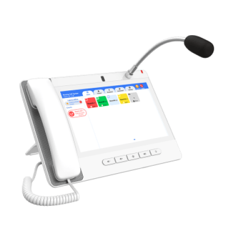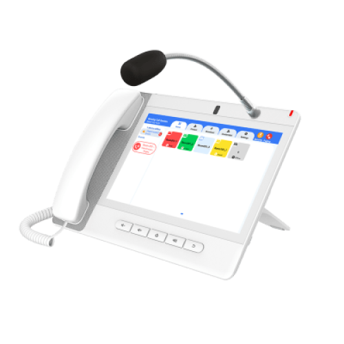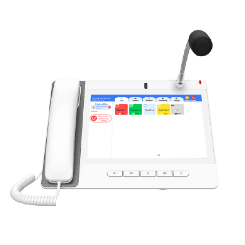 Teléfono IP Color Blanco Android 9.0 Empresarial para voceo 20 líneas SIP, pantalla táctil, Wi-Fi y Bluetooth, PoE, Voceo/ Musica por Multicast, puertos Gigabit, Sofware de Enfermeria