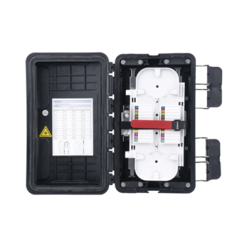 Caja de Distribución de Fibra Óptica, Hasta 96 Empalmes, Exterior IP65, Color Negro