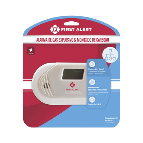 Detector Combo de Combinación de Gases Explosivos: Metano (GN), Propano (LP) y Monóxido de Carbono (CO), Con Pantalla Digital Retroiluminada, 120 Vca y Batería de Respaldo