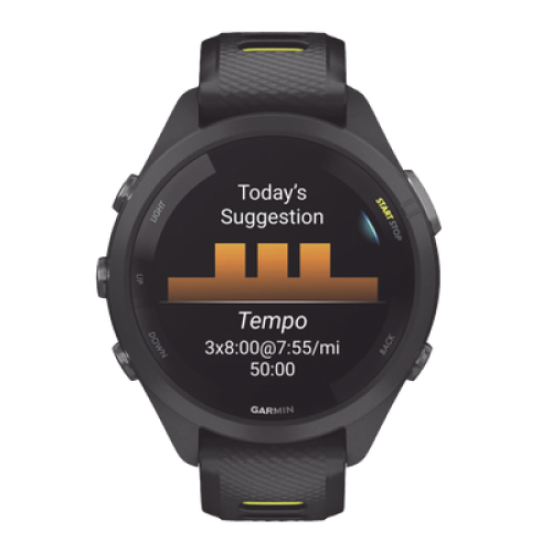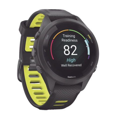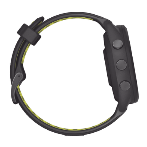 Forerunner® 265S, Bisel y carcasa en negro con correa de silicona en negro/amarillo