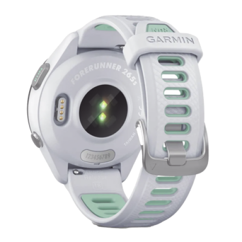 Forerunner® 265S, Bisel negro con carcasa en blanco y correa de silicona en blanco/verde
