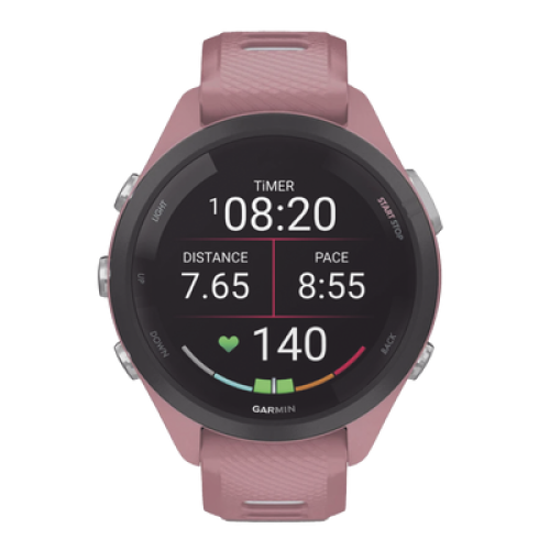 Forerunner® 265S, Bisel negro con carcasa en rosa y correa de silicona en rosa/gris