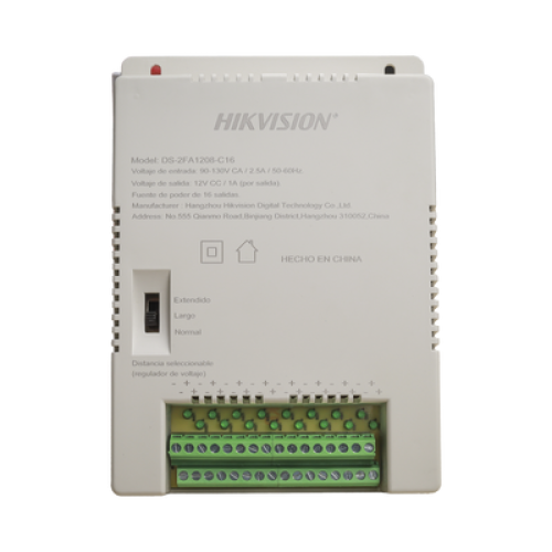 Fuente de Poder Regulada 12 Vcc / 13.5 Vcc / 15 Vcc para 16 Cámaras / 16 Amp (1 Amp por Salida) / Voltaje de Entrada 90 - 130 VCA / Soporta 4K / Modo para Largas Distancias