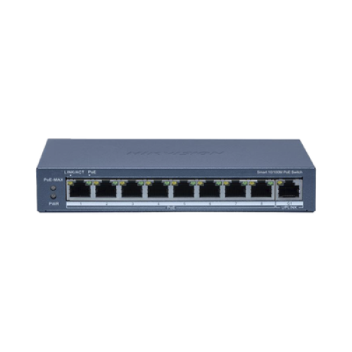 Switch PoE+ / Monitoreable / 8 Puertos 10/100 Mbps PoE+ / 1 Puerto 1000 Mbps Uplink / Configuración Nube Hik-Partner Pro / Modo Extendido hasta 300 metros / 60 W