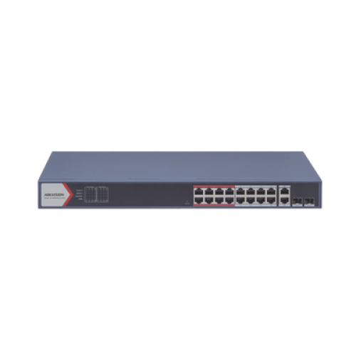 Switch PoE+ / Monitoreable / 16 puertos 10/100 Mbps PoE+ / 2 Puertos 1000 Mbps Uplink / 2 Puertos SFP de Uplink / Configuración Nube Hik-Partner Pro / Modo Extendido hasta 300 metros / 230 W