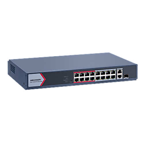 Switch PoE+ / No Administrable / 16 Puertos 10/100 Mbps PoE+ / 2 Puertos 1000 Mbps Uplink / 1 Puerto SFP Uplink / Modo Extendido hasta 300 Metros / 130 W