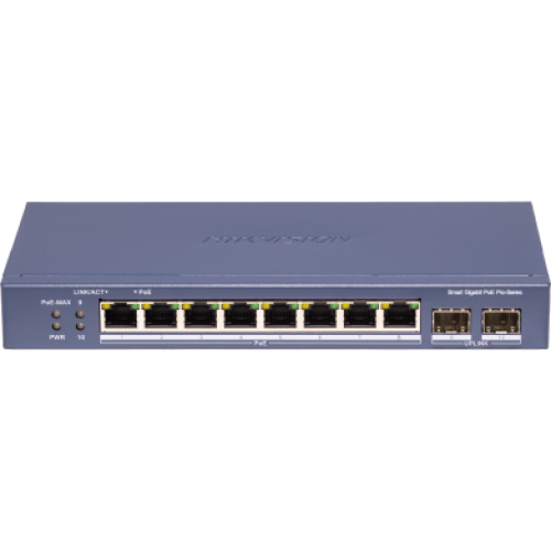 Switch PoE+ / Administrable / Uso en Rack / 8 Puertos 10/100 PoE+ / 2 Puertos 1000 Mbps Uplink / 2 Puertos SFP / Configuración Nube desde Hik-PartnerPro / Modo Extendido hasta 300 Metros / 125 W