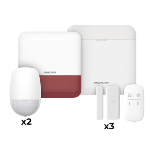 (AX PRO) KIT de Alarma AX PRO / Incluye: 1 Hub con batería de respaldo / 2 Sensores PIR / 3 Contactos Magnéticos mini / 1 Control Remoto / 1 Sirena Inalambrica Exterior color rojo / WiFi / Compatible con Hik-Connect P2P
