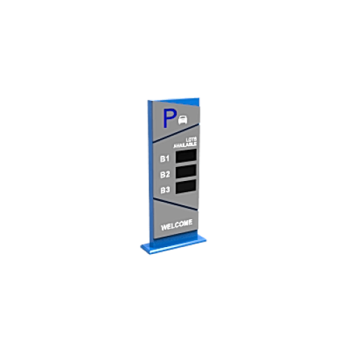 Pantalla informativa de entrada ubicada en la entrada del estacionamiento, mostrando mensajes de bienvenida e información de espacios disponibles de todo el estacionamiento para guiar al conductor a estacionarse rápidamente.