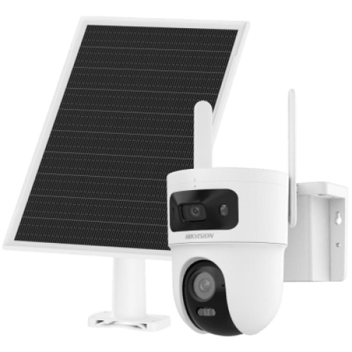 Kit Solar IP All in One Doble Lente / AOV / PT IP 4 Megapixel Lente 4 mm / Fijo 4 Megapixel Lente 2.8 mm / Panel Solar + Batería de Respaldo de Litio (9000 mAh) / Conexión 4G / Audio de Dos Vías / Dual Light / IP66 / Micro SD