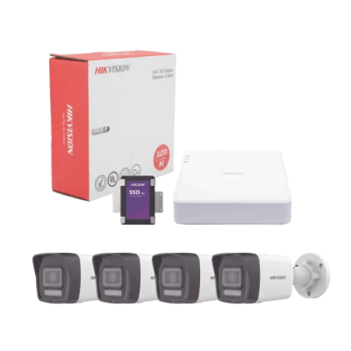 Kit IP 4 Megapixel / NVR de 4 Canales con 4 Puertos PoE / 4 Cámaras IP Bala Dual Light (IR + Luz Blanca) con Microfono Integrado y ACUSENSE Lite para Exterior/ Bobina de Cable de 100 mts / SSD de 1 TB