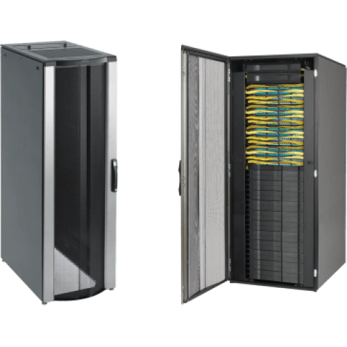 - Las puertas superior, delantera y trasera totalmente perforadas permiten el máximo movimiento de aire alrededor de cables, paneles de conexión y otros equipos de red