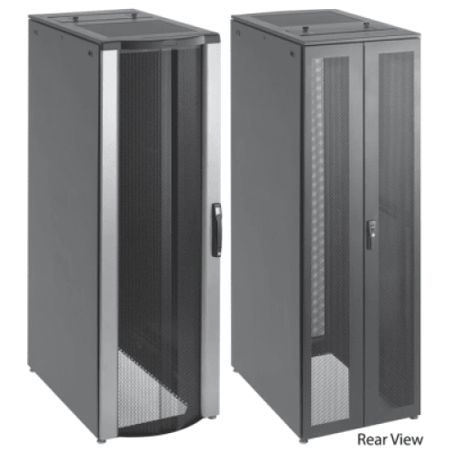 Gabinete rack diseñado específicamente para alojar servidores PC con gestión optimizada de cables de alimentación. Su diseño profundo de 1200 mm permite acomodar equipos de servidor estándar mientras gestiona eficientemente el cableado de potencia. El sistema de enfriamiento por flujo de aire pasivo optimizado permite su instalación en salas de datos de forma aleatoria o en configuraciones de pasillos fríos/calientes. Construido en acero de calibre 16 con acabado en polvo negro RAL 9005, ofrece durabilidad y resistencia estructural. La arquitectura de puertas totalmente perforadas frontales, traseras y superior maximiza la circulación de aire alrededor del equipo, cumpliendo con los requisitos de espacio abierto de los fabricantes de servidores.