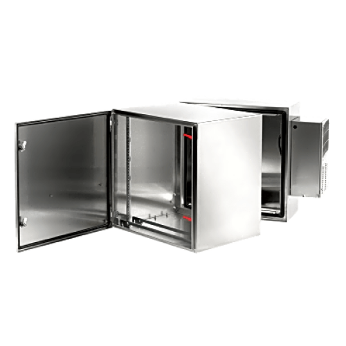 Los gabinetes de pared PROTEK de doble bisagra representan una solución premium para el montaje de equipos electrónicos en rack 19 pulgadas donde el espacio es limitado. Su diseño de tres partes (puerta, sección central y sección de pared) proporciona acceso completo tanto frontal como posterior al equipo montado. Fabricados en acero de calibre 14 y 16 o acero inoxidable tipo 304, ofrecen protección certificada NEMA Tipo 4, 4X y 12, equivalente a IP66/IP55 e IK10. Incluyen juntas de poliuretano inyectadas sin costuras para sellado hermético contra agua, polvo y agentes corrosivos. Ideales para aplicaciones industriales, telecomunicaciones y centros de datos donde se requiere protección ambiental completa y montaje en pared.