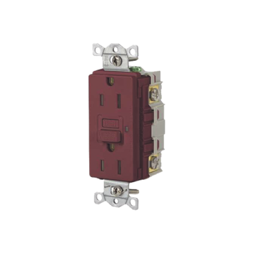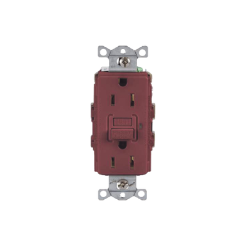 Contacto de Auto-verificación GFCI con Interruptor de Falla a Tierra de 15 A 125 V 2 Polos/ Color Rojo / Nema 5-15R / Grado Industrial Comercial.