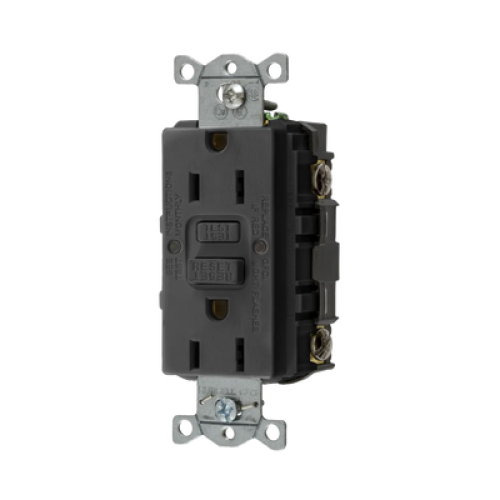 Contacto de Auto-verificación GFCI con Interruptor de Falla a Tierra de 15 A 125 V 2 Polos, 3 Hilos Color Negro (Nema 5-15R), Grado Comercial.