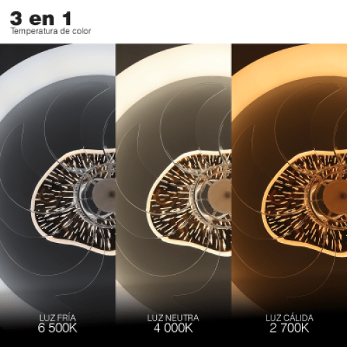 Ventilador de Techo con Luminario LED de 110 V CA 50/60 Hz / 88 W / 3 Tonos de Luz (6500 - 4 000 - 2 700 K) / Diámetro 500 mm / 6 Velocidades / Dimeable.