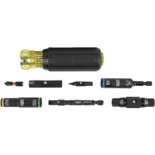 El destornillador / llave de tuercas 10 en 1 KNECT™ de Klein es una herramienta multifuncional diseñada para uso con impacto, compatible tanto con herramientas eléctricas como con el mango de destornillador incluido. Este innovador diseño elimina la necesidad de accesorios adicionales, ofreciendo versatilidad y eficiencia en una sola herramienta. Incluye 3 puntas populares, se convierte en 5 tamaños de llave de tuercas y cuenta con un portabrocas KNECT™ de 12 puntos y 1/2 pulgada, además de un soporte para brocas de 1/4 pulgada.