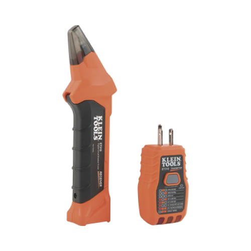 - Probador GFCI que consta de dos piezas: un transmisor conectado al tomacorrientes o accesorio eléctrico, y un receptor que se usa para escanear el cortacircuitos correcto en el panel.