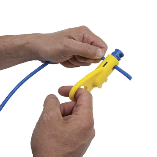- Pelacables radial (Cat. n.º VDV110-261) con una duradera cuchilla de acero de alto contenido de carbono que se ajusta automáticamente a los diferentes diámetros de cable para evitar dañar los conductores.