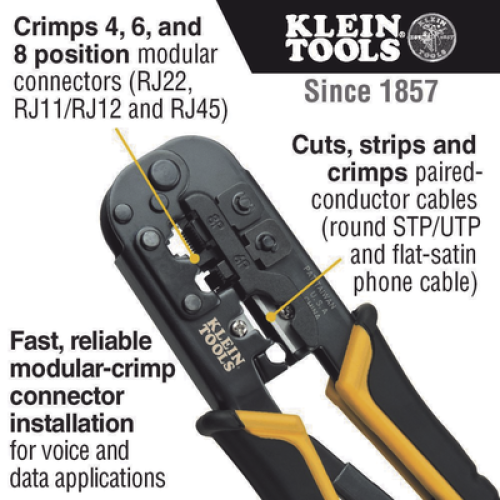 - Poncha conectores modulares de 4, 6 y 8 posiciones (RJ22, RJ11/RJ12 y RJ45)