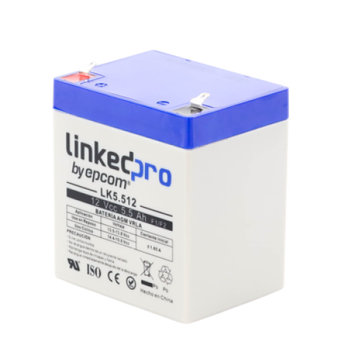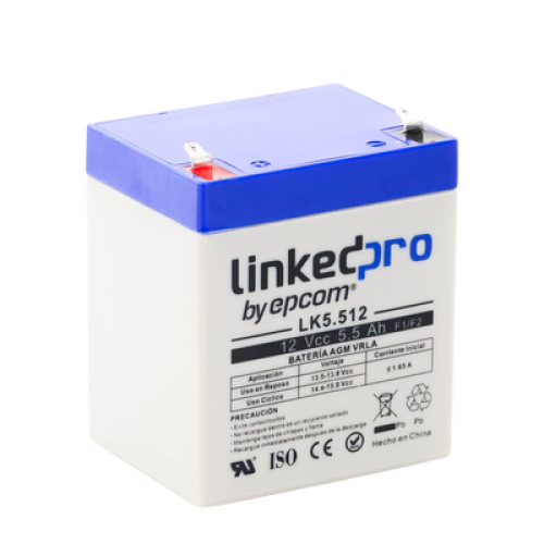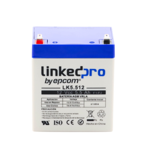 Batería 12 V / 5.5 Ah / UL / Vida útil promedio 5 años / Tecnología AGM / Para uso en equipo electrónico, Alarmas de Intrusión / Incendio/ Control de acceso / Video Vigilancia / Terminales F1 ( Incluye adaptador F