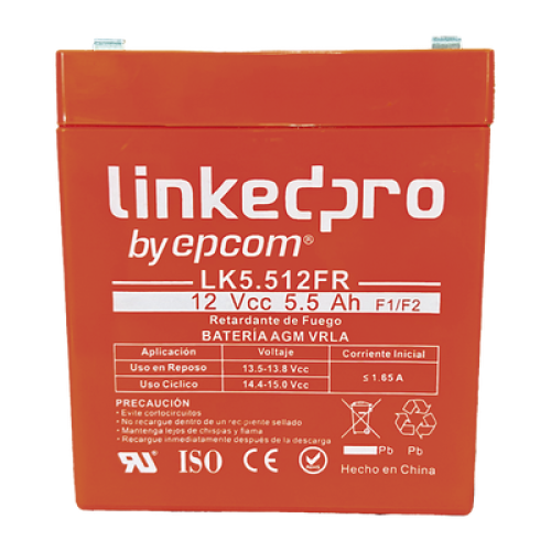 Batería 12 V / 5.5 Ah / UL / Tecnología AGM / Vida útil promedio de 5 años / Retardante a la Flama / Para uso en equipo electrónico, Alarmas de Intrusión / Incendio/ Control de acceso / Video Vigilancia / Incluye