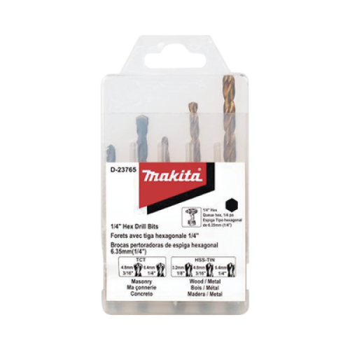 Juego de 5 Brocas con Inserción Hexagonal de 1/4". De concreto: 3/16" y 1/4". Para metal: 1/8", 3/16" y 1/4".