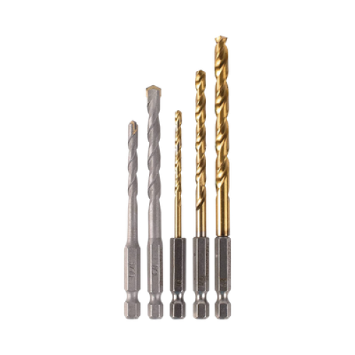 Juego de 5 Brocas con Inserción Hexagonal de 1/4". De concreto: 3/16" y 1/4". Para metal: 1/8", 3/16" y 1/4".