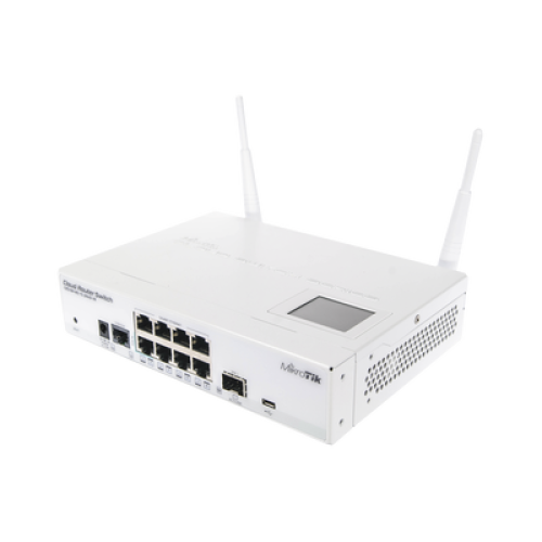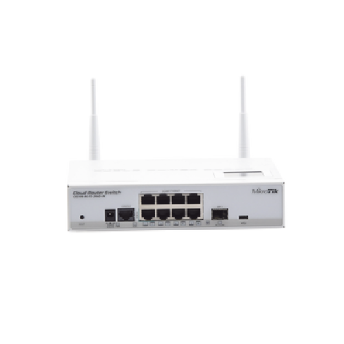 Cloud Router Switch 109-8G-1S-2HnD-IN es un nuevo miembro de la serie CRS de bajo costo y tamaño compacto. Incluye ocho puertos Ethernet Gigabit y una potente radio inalámbrica de 2.4GHz con salida de 1000mW. Soporta PoE 802.3af/at y funciona con voltajes de 10-57V.