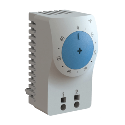 Termostato/Interruptor Para Control de Temperatura en Grados Celsius, Para Uso con Ventiladores, Con Terminales de Conexión, y Clip para Riel Din de 35 mm, Color Gris Claro