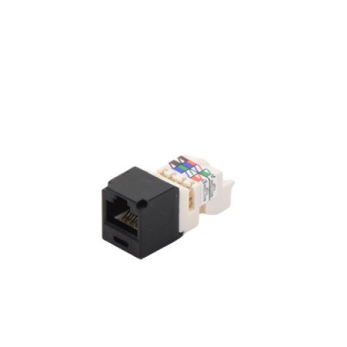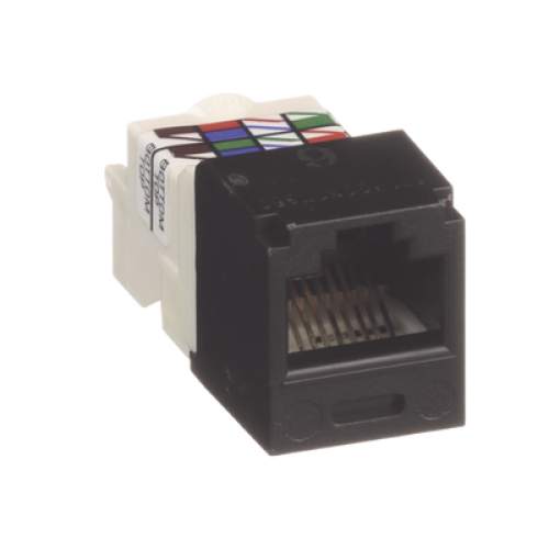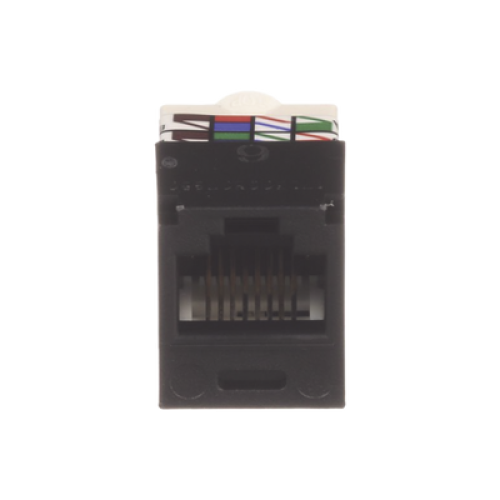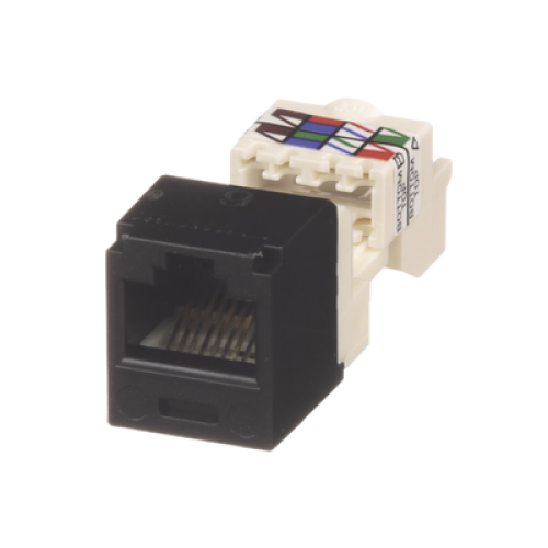 El módulo de conector UTP Categoría 6/Clase E de 8 posiciones, se termina en cable de 4 pares 22 - 26 AWG de par trenzado sin blindaje de 100 ohms y no requiere el uso de una herramienta de impacto. Los módulos de conector UTP usan un método de terminación de movimiento hacia adelante para optimizar el rendimiento al mantener la geometría del par de cables mientras se elimina el destrenzado del conductor. La tapa de terminación esta codificada por color blanco para designar el rendimiento de la Categoría 6 e incluye una etiqueta universal codificada para los esquemas de cableado T568A y T568B.