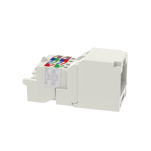 El módulo de conector UTP Categoría 6/Clase E de 8 posiciones, se termina en cable de 4 pares 22 - 26 AWG de par trenzado sin blindaje de 100 ohms y no requiere el uso de una herramienta de impacto. Los módulos de conector UTP usan un método de terminación de movimiento hacia adelante para optimizar el rendimiento al mantener la geometría del par de cables mientras se elimina el destrenzado del conductor. La tapa de terminación esta codificada por color blanco para designar el rendimiento de la Categoría 6 e incluye una etiqueta universal codificada para los esquemas de cableado T568A y T568B.