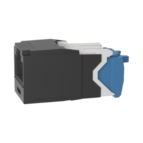 El módulo de conector UTP Categoría 6A/Clase EA de 8 posiciones, se termina en un cable de par trenzado sin blindaje de 4 pares, 22 - 26 AWG d 100 ohms y no requiere el uso de una herramienta de impacto. La tapa de terminación tiene un código de color azul para designar el rendimiento de la Categoría 6A e incluye una etiqueta universal codificada para los esquemas de cableado T568A y T568B. El módulo de conector Mini-Com® TX6A 10Gig UTP se instala como parte del sistema de cableado de cobre TX6A 10Gig UTP para lograr el rendimiento certificado IEEE 10GBASE-T.