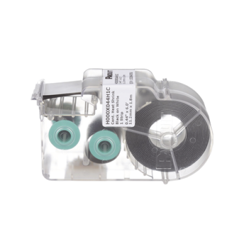 El casete de etiquetas termorretráctiles de poliolefina de grado militar H000X044H1C contiene un dispositivo de memoria integrado para formateo automático, recuperación de la última leyenda utilizada y la cantidad de etiquetas que quedan en el casete. El casete contiene un rollo continuo de material no adhesivo que se puede cortar a medida.