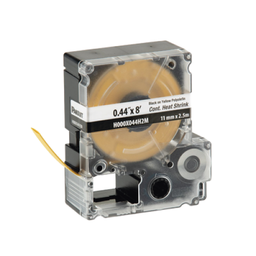 Las etiquetas termorretráctiles continuas de la impresora portátil de color amarillo están fabricadas con poliolefina de calidad militar. Miden 0.25' (6.4 mm) de diámetro, 8' (2.4 m) de largo y 0.44' (11.2 mm) de ancho, y presentan un rango de cableado de 16-10 AWG. El casete de etiquetas MP™ de carga rápida incluye material de etiquetado y cinta que permite el cambio simple de etiquetas.