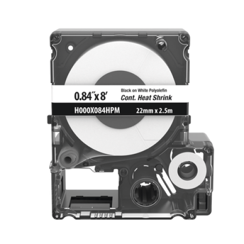 Las etiquetas termorretráctiles continuas de la impresora portátil de color blanco están fabricadas con poliolefina de calidad militar de 2:1. Miden 0.84' (21.3mm) de diámetro y 8' (2.4 m) de largo, y presentan un rango de cableado de 8-1 AWG. El casete de etiquetas MP™ de carga rápida incluye material de etiquetado y cinta que permite el cambio simple de etiquetas.