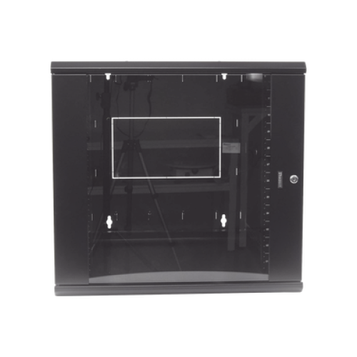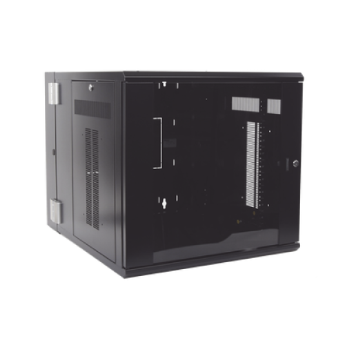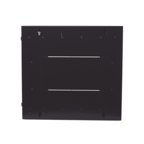 Gabinete de montaje en pared construido en acero, soporta 12 unidades de Rack para equipos de red activos o pasivos. Cuenta con paneles laterales totalmente desmontables y está diseñado para permitir el control de clima adecuado para uso con diversos equipos de red, así como Switches de alimentación remota (PoE) y fuentes de alimentación ininterrumpida (UPS).
