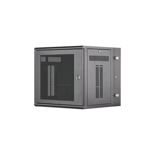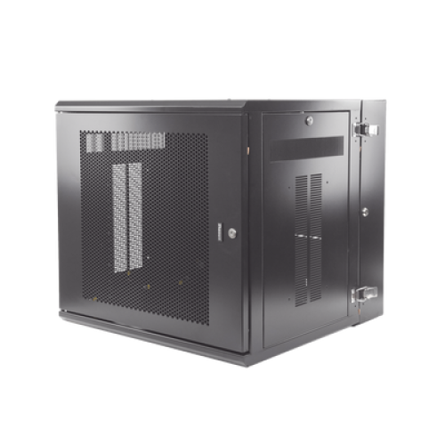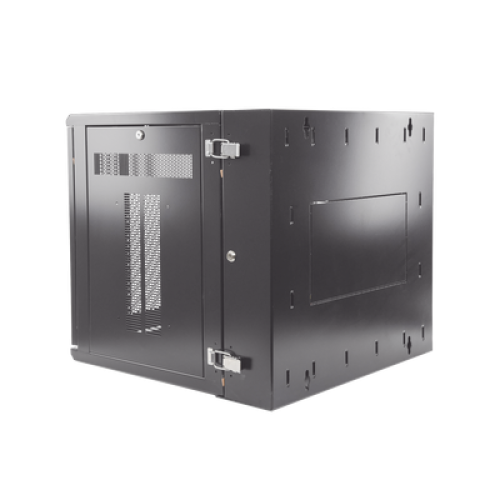 Gabinete de montaje en pared construido en acero, soporta 12 unidades de Rack para equipos de red activos o pasivos. Cuenta con paneles laterales totalmente desmontables y está diseñado para permitir el control de clima adecuado para uso con diversos equipos de red, así como Switches de alimentación remota (PoE) y fuentes de alimentación ininterrumpida (UPS).